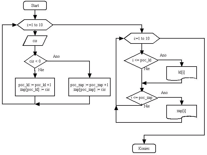 Výpočet a tlač hodnôt. Načíta 10 čísel, ktoré rozdelí na kladné a záporné do dvoch stĺpcov.